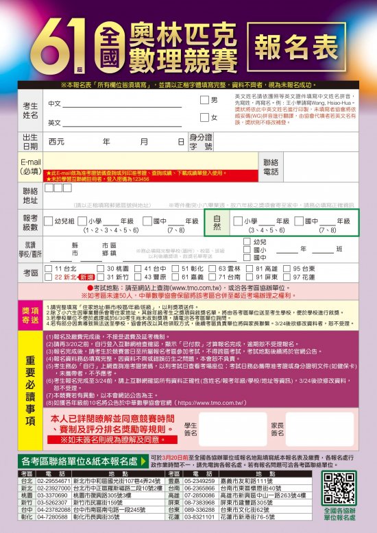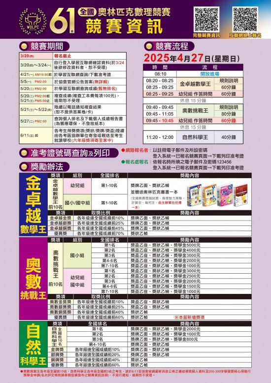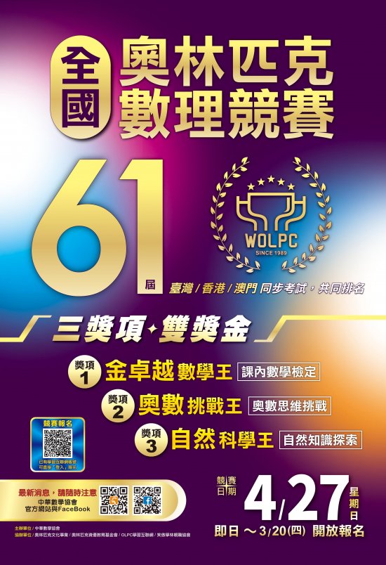 中華數學協會訂於114年4月27日(星期日)舉辦 「第61屆全國奧林匹克數理競賽」