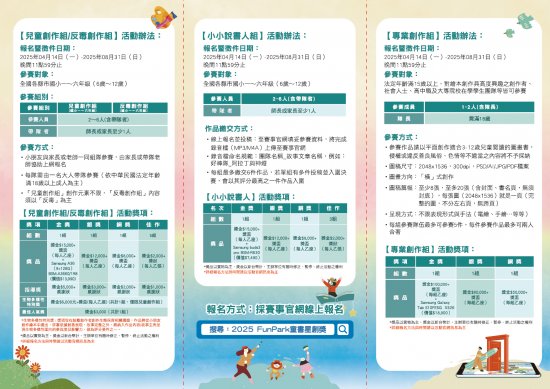 一、 | 本賽事徵件期間自即日起至 114 年 8 月 31 日止,一律採網路報名,報名網址: https://story.funpark.com.tw/。各組徵件對象及參賽資格說明如下: |