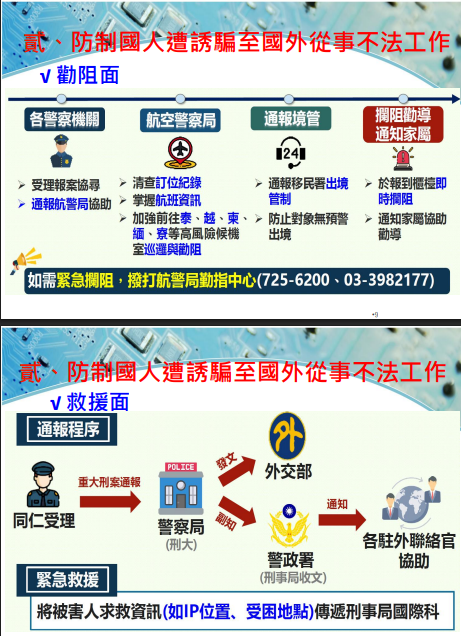 二、 | 旨案已由本縣警察局刑事警察大隊完成類案分析,並彙編宣導影音暨圖卡供防制人口販運工作各網絡單位辦理宣導供作參考運用。 |