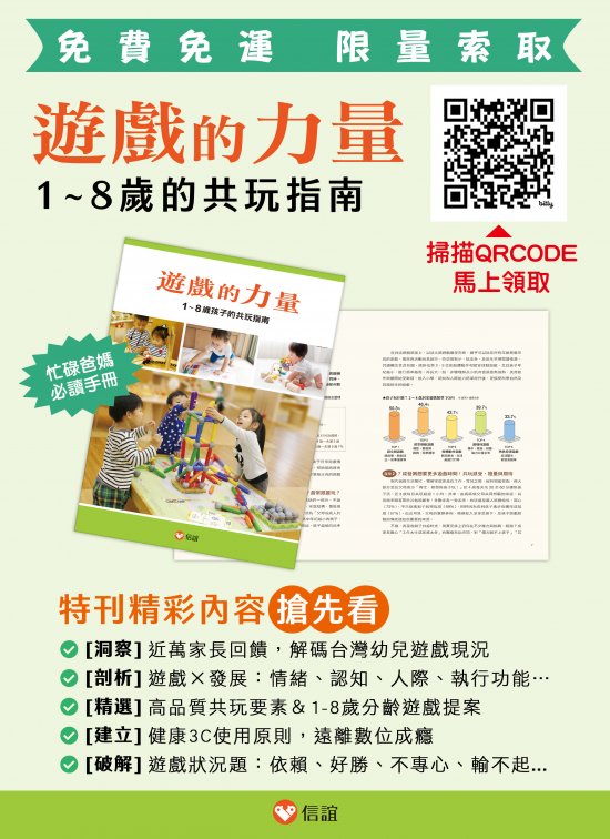 一、信誼基金會為關心國內幼兒遊戲行為與發展,透過網路調查邀請家長分享觀察,共收集 9,981 份有效數據,進一步分析歸納 2-8 歲居家遊戲、友伴互動及 3C 使用等現況,並邀請腦科學、心理學與幼教等專家解讀遊戲背後的發展密碼,編纂《遊戲的力量: 1-8 歲孩子的共玩指南》特刊,深入探討遊戲經驗對各階段成長的重要性,亦提供分齡引導策略與常見問題解決方案。