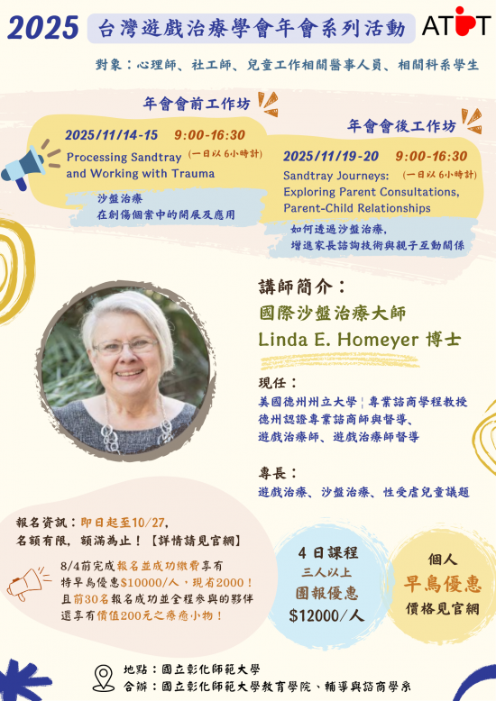 2、於 08/04 前完成報名並繳費者,享有特早鳥優惠價!前 30 名報名成功並全程參與者,享有價值 200 元療癒小物,詳情請參考學會報名網站(https://www.atpt.org.tw/course-id-205)。